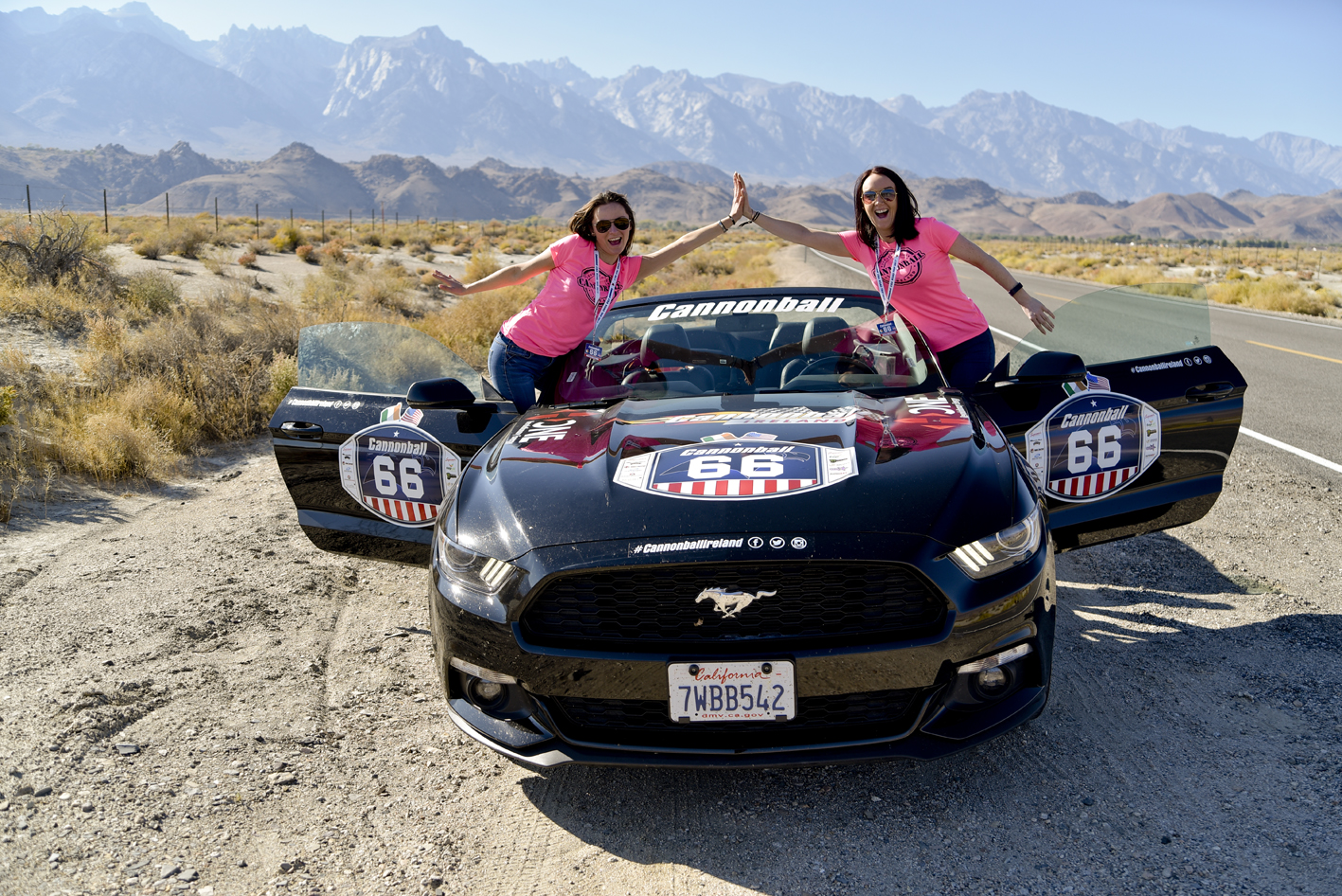NO FEE PIC 02/11/17: Kasia Farat and Valerie Grogan pictured taking a pitstop in Death Valley at the first Cannonbal USA. Ireland’s CANNONBALL supercar event is currently blazing a trail through America. A group of sixty Irish Cannonballers jetted off from Dublin to San Francisco this week for the largest and most exhilarating foreign CANNONBALL event. The route takes in San Fransisco, Yosemite National Park, Mammoth Lakes, Death Valley, Las Vegas, Hollywood, Los Angeles, Santa Barbara and Santa Maria and Carmel before looping back to San Francisco and Cannonballers are driving in style in a convoy of high performnce convertible Muscle cars including Ford Mustangs, Cameros and Dodge Chargers and a Shelby. Cannonball is an Irish Superrcar Event which has raised almost €1,000,000 for Irish Childrens Charities. Photo: Kasia Farat
